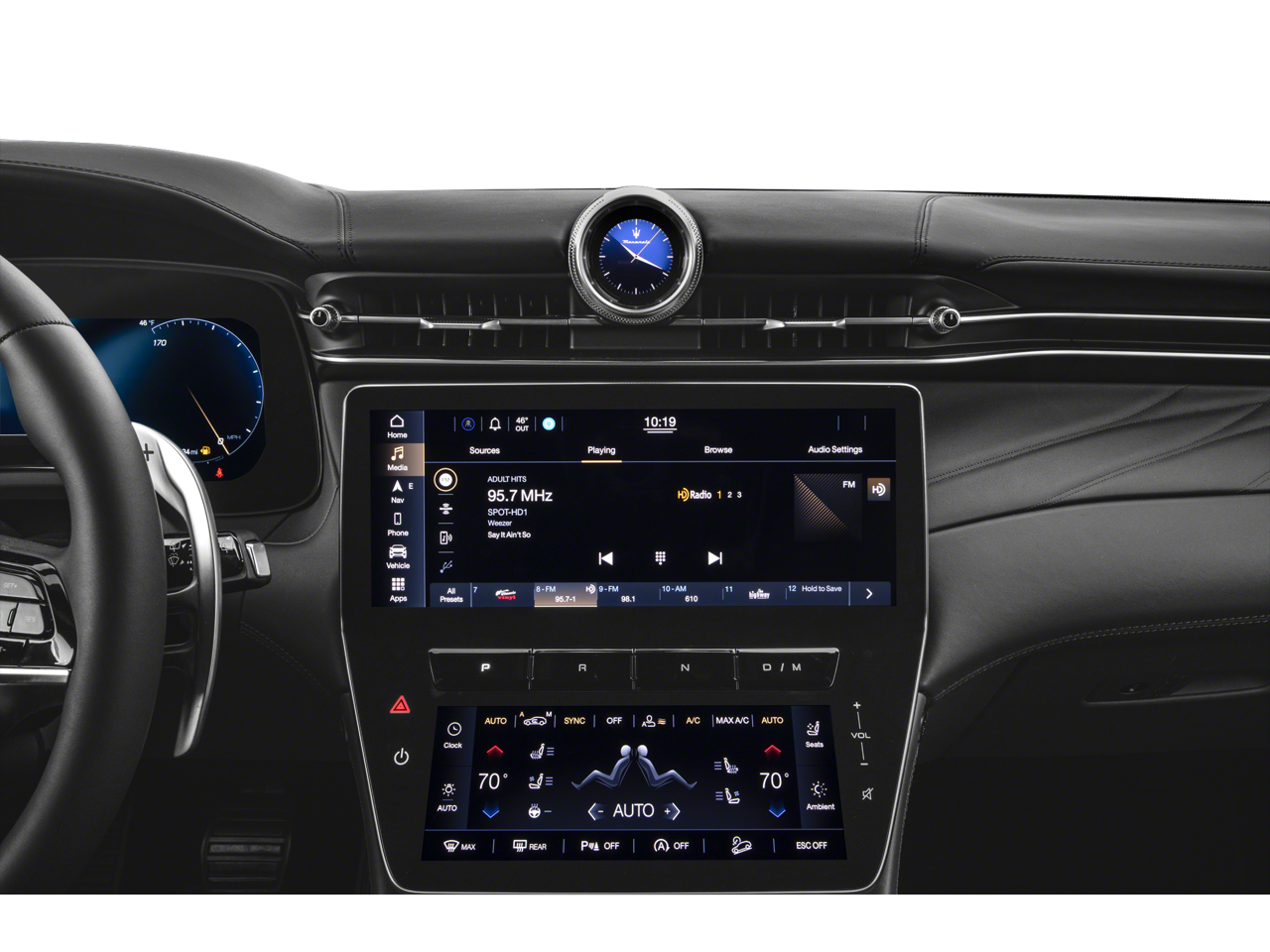 - Radio: Sonus Faber 860 Watts Premium Audio System -inc: 14 speakers w/subwoofer, Maserati Intelligent Assistant (MIA), 12.3" upper touchscreen, 8.8" lower touchscreen, navigation, HD radio, SiriusXM radio w/1-year trial subscription, wired and wireless Apple CarPlay and Android Auto, Maserati connected services w/trial subscriptions, Alexa in-vehicle voice assistant and eCall and bCall w/trial subscriptions